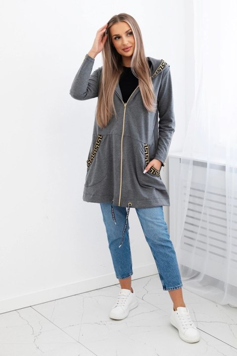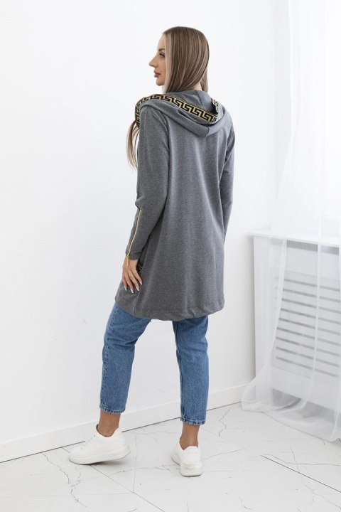 Prezentujemy Państwu wygodną długą bluzę z kapturem. Bluza posiada zapięcie na suwak oraz ozdobne taśmy przy kieszeniach i kapturze. Bluza wykonana jest z wysokiej jakości materiału. Rozmiar jest uniwersalny i będzie odpowiedni dla Pań noszących rozmiar S, M lub L.