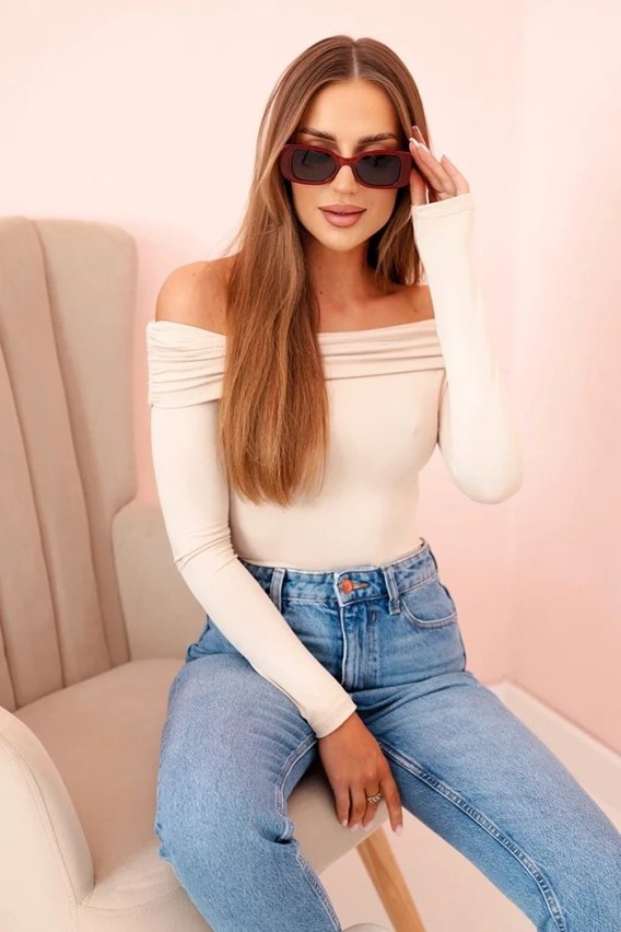 Bluzka body damska z długim rękawem i odkrytymi ramionami beżowa