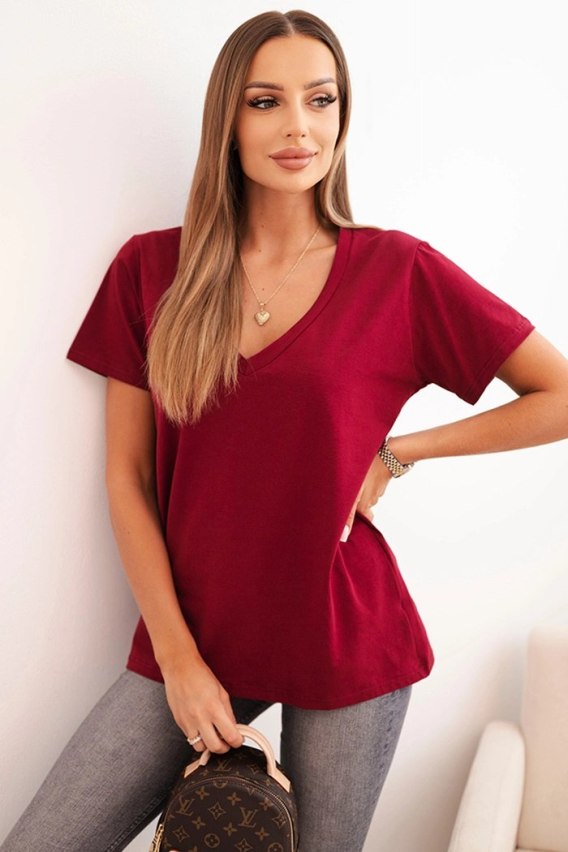 Bluzka damska bawełniana z dekoltem w serek z krótkim rękawem bordowa