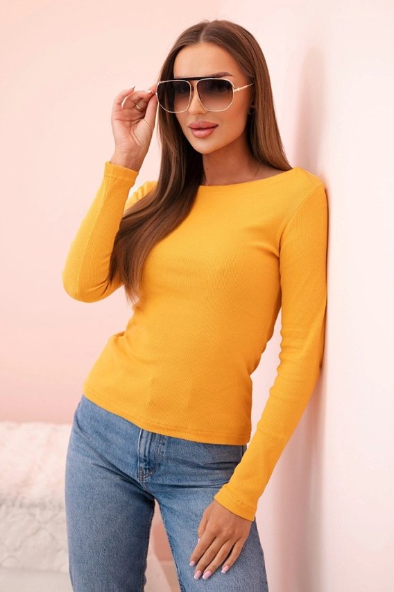 • Bluzka damska bawełniana z długim rękawem i dekoltem łódką musztardowa