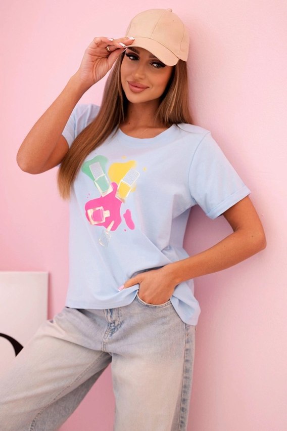 Bluzka damska bawełniana z krótkim rękawem i kolorowym nadrukiem niebieska