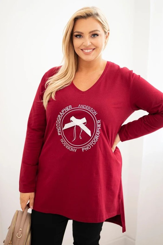 Bluzka damska z dłuższym tyłem i nadrukiem bordowa
