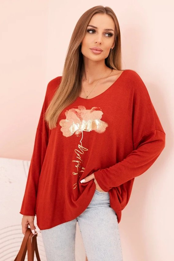 Bluzka damska z wiskozy z długim rękawem i złotym kwiatowym nadrukiem ruda
