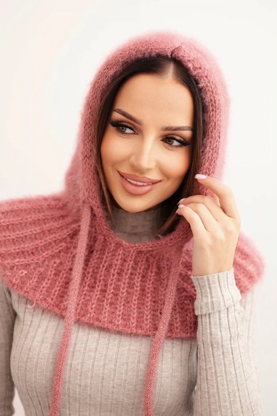 Czapka kaptur damski z delikatnym splotem z troczkami ciemno różowy