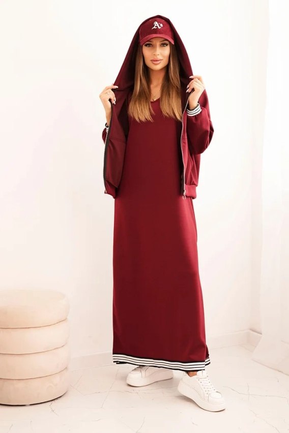 • Komplet damska z wiskozą z rozpinaną bluzą i długą sukienką bordowa
