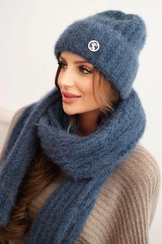 Komplet damski czapka i długi szalik z miękkiej przędzy jeansowy
