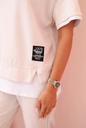 Ten komplet dresowy damski to idealna propozycja dla kobiet, które cenią sobie wygodę, modny wygląd i funkcjonalność w codziennym ubiorze. Składa się z luźnej bluzki z krótkim rękawem i modnym podwójnym dołem oraz wygodnych spodni z elastycznym pasem i troczkiem, dzięki czemu dopasowuje się idealnie do sylwetki. Materiał z dodatkiem elastanu zapewnia elastyczność i komfort przez cały dzień, a nowoczesny fason sprawia, że komplet świetnie sprawdzi się zarówno w domowym relaksie, jak i podczas spaceru czy spotkania z przyjaciółmi. Styl casualowy, uniwersalne zastosowanie i swobodny krój czynią ten zestaw doskonałym wyborem na każdą nieformalną okazję. Produkcja Włoska to gwarancja jakości i dbałości o detale. Rozmiar jest uniwersalny i będzie odpowiedni dla Pań w rozmiarze S, M lub L.