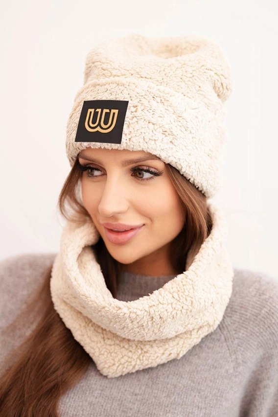 Komplet damski polarowy czapka i komin z ozdobną naszywką beżowy