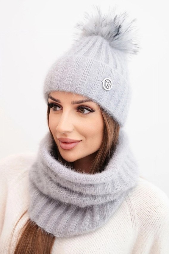 Stylowy i praktyczny komplet zimowy dla kobiet - czapka z efektownym, dużym pomponem oraz miękki komin. Wykonany z przyjemnej w dotyku, puszystej dzianiny o lekkim połysku. Zapewnia komfort cieplny i modny wygląd w chłodne dni.