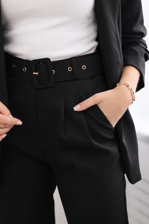 Prezentujemy Państwu elegancki komplet marynarki i spodni. Marynarka bez zapięcia z klapami z przodu. Marynarka posiada podszewkę. Spodnie z kieszeniami oraz paskiem. W pasie spodni z tyłu wszyta elastyczna taśma. Bardzo modny i stylowy komplet. Komplet wykonany jest z wysokiej jakości materiału. Rozmiar jest uniwersalny i będzie odpowiedni dla Pań w rozmiarze S, M lub L.
