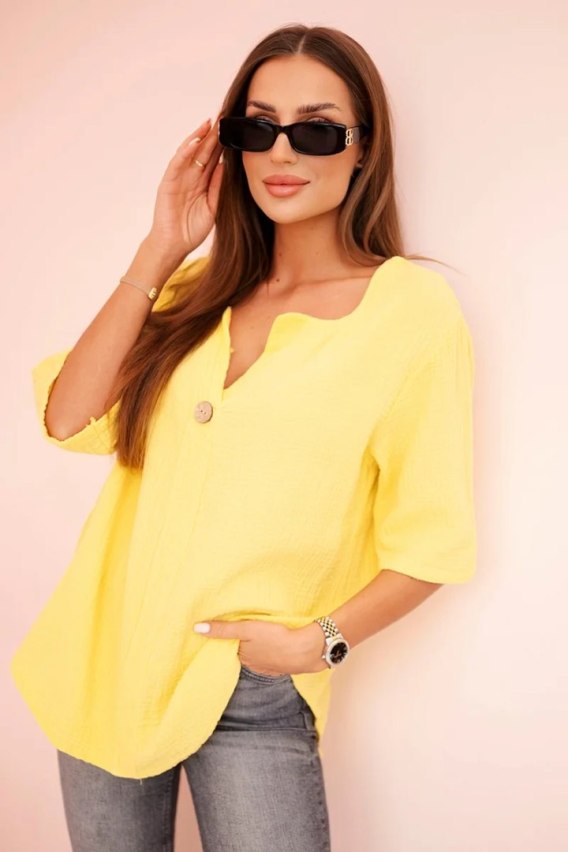 Lekka, przewiewna i niezwykle komfortowa - ta koszula damska z miękkiego muślinu to idealny wybór na ciepłe dni. Swobodny krój zapewnia wygodę noszenia, a dekoracyjny guzik dodaje jej nieco casualowego charakteru. Możesz nosić ją zarówno na co dzień, jak i jako element stylizacji w stylu boho.