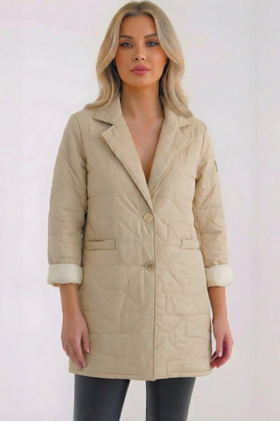 Kurtka damska Plus Size pikowana z ozdobnymi guzikami i kołnierzem ciemno beżowa