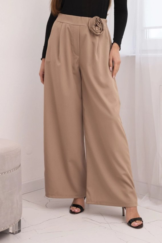 Spodnie damskie eleganckie z szeroką nogawką i ozdobnym kwiatem fango