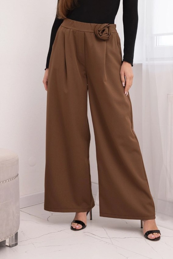 Spodnie damskie eleganckie z szeroką nogawką i ozdobnym kwiatem jasno brązowe