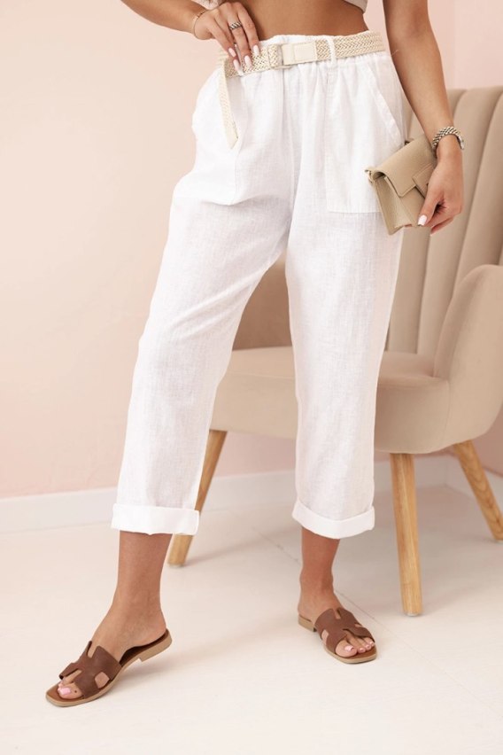 Spodnie damskie lniane z bawełną i paskiem białe