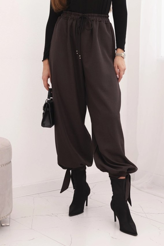 Spodnie damskie z szeroką nogawką i wiązaniem u dołu brązowe