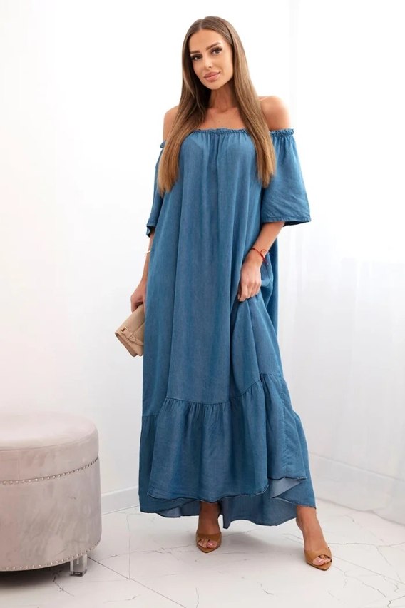 • Sukienka damska z krótkim rękawem i falbaną ciemno jeansowa