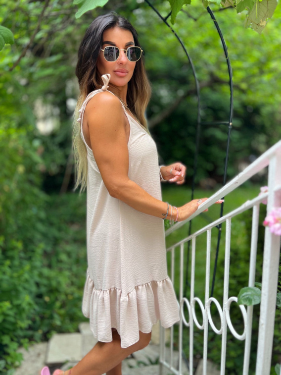 Letnia sukienka na ramiączka w stylu oversize wykończona falbaną u dołu.