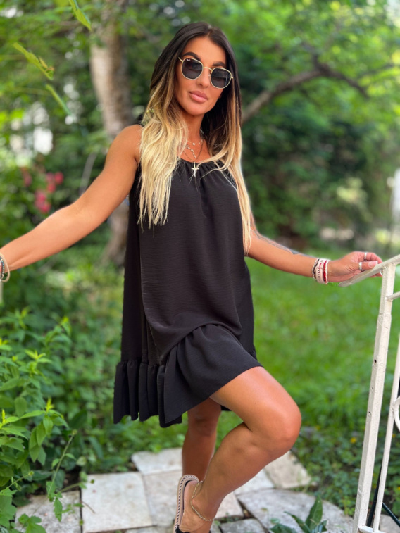 Letnia sukienka na ramiączka w stylu oversize wykończona falbaną u dołu.