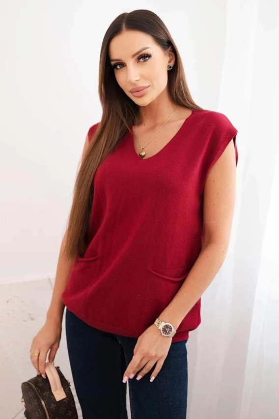 Sweter damski wiskozowy bez rękawów z kieszeniami i dekoltem V bordowy